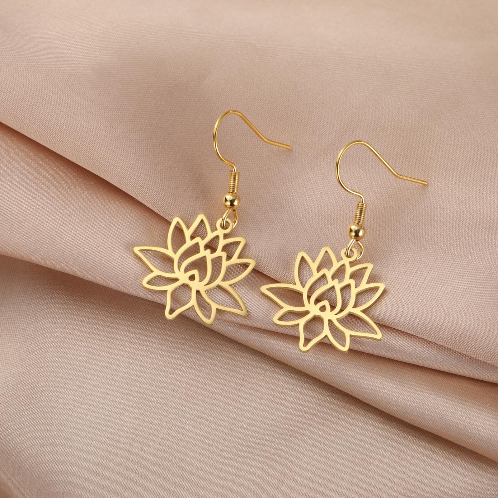 Lotus Flower Earrings Bohemian Dangle Drop Earrings Stainless Steel Buddism Yoga Healing Earrings Unalome Symbol Amulet Religious Jewelry