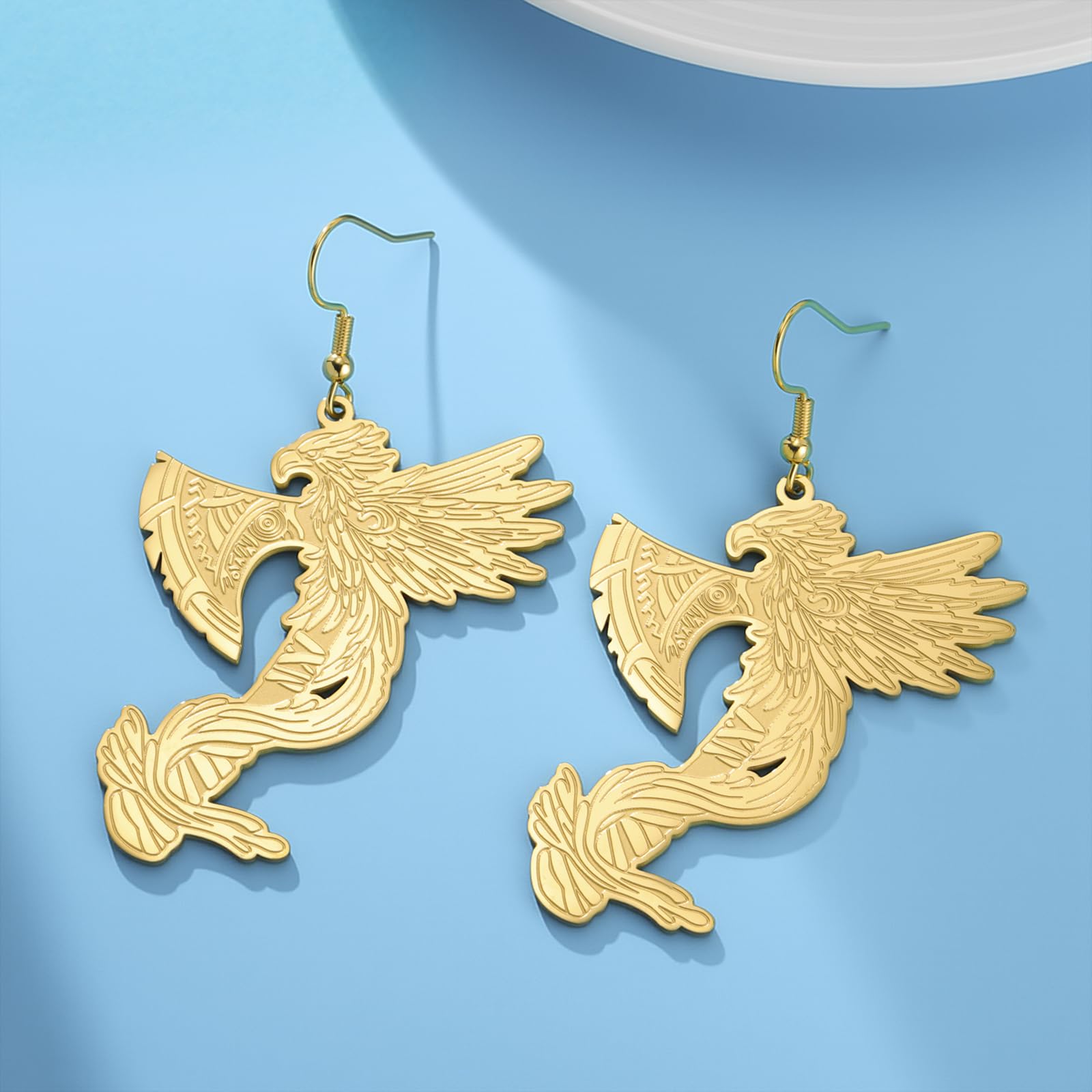 - Unique Design: These stunning phoenix viking earrings combine the mythical phoenix and a viking axe, creating a striking piece for any jewelry collection. Perfect for those who appreciate mythology jewelry;