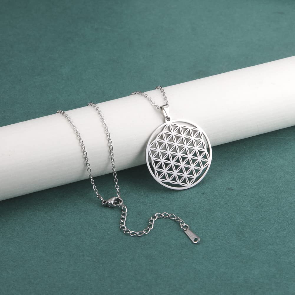 Sacred Geometry Necklace Flower of Life Pendant Necklace Stainless Steel Circle Engrave Flower Necklace Protection Amulet Charm Necklace Spiritual Necklace Jewelry for Women Men, 17-19 inches Adjustable Chain