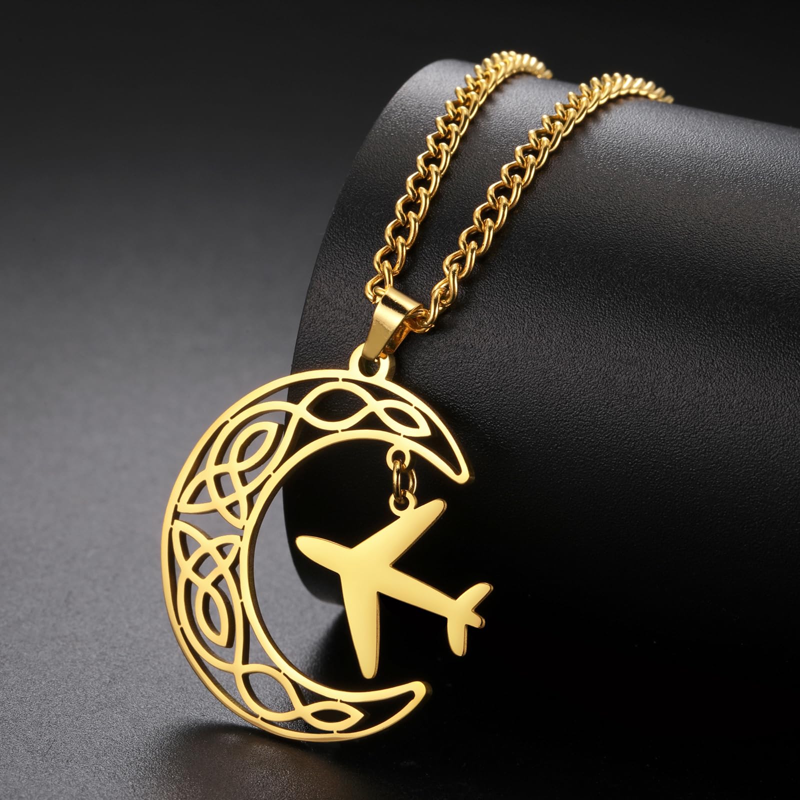 VASSAGO Airplane Necklace for Women Men Celtic Moon Necklace Stainless Steel Aircraft Pendant Necklace Airplane and Crescent Moon Jewelry Gift