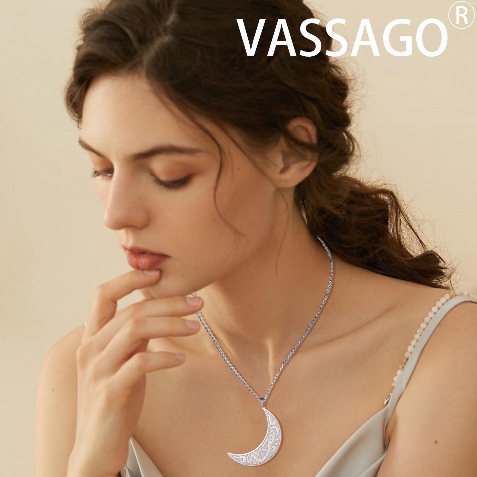 VASSAGO Islamic Necklace Muslim Allah Necklace for Women Men Stainless Steel Crescent Moon Arabic Allah Necklace Muslim Islam Religious Jewelry