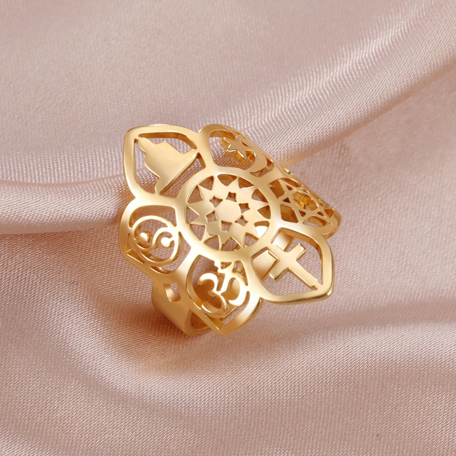 VASSAGO Lotus Flower Adjustable Ring Coexist Om Cross Islam Star Moon Star of David Yin Yang Yoga Ring for Women Gilrs Religious Jewelry Gift