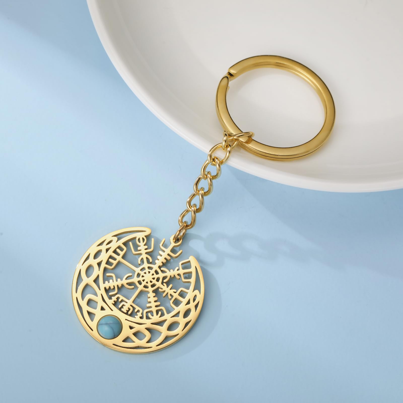 - Design Inspiration: This exquisite Viking keychain features a stunning Celtic moon design, elegantly adorned with a vibrant turquoise gemstone at its center. The intricate details of the Celtic Knot symbolize unity and eternity, while the Vegvisir, known as the Norse compass, represents guidance and protection. This unique blend of symbols makes it a meaningful accessory for anyone who values Norse mythology and culture;
