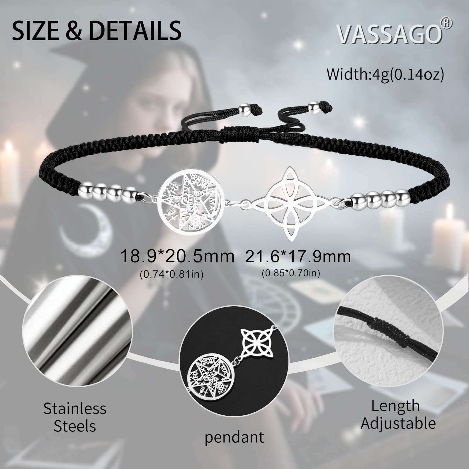 VASSAGO Witches Knot Bracelet Tetragrammaton Pentagram Bracelet Celtic Knot Pendant Name of God Adjustable Braided Rope String proteccion Witchcraft Pagan Jewelry for Women Men