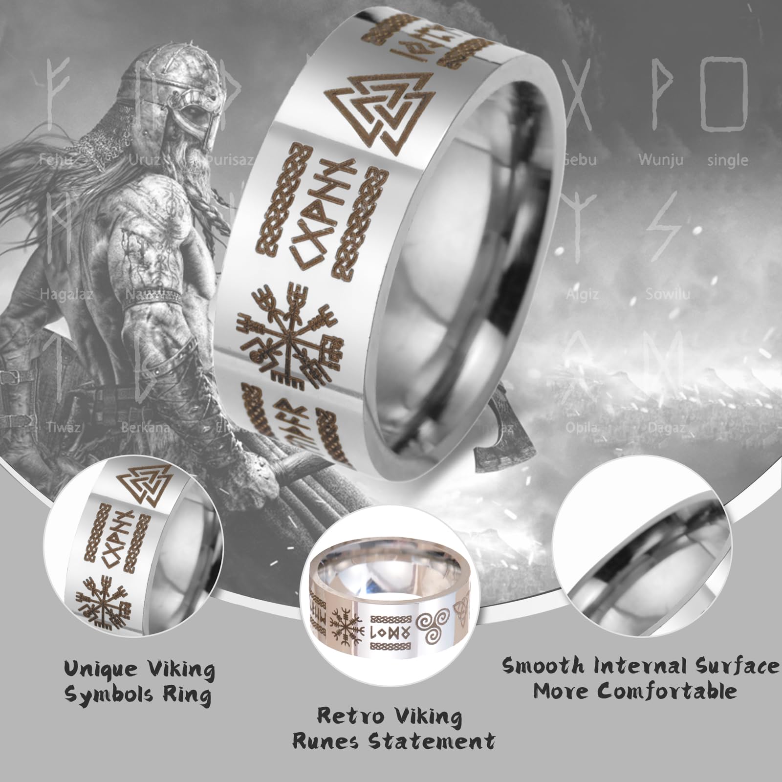 - Material: Made from premium stainless steel, sturdy and maintaining vintage aesthetic. Viking runes rings, symbol of bravery and fearlessness, will show your Viking spirit charm and help you gain more praise;